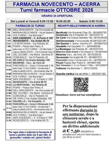 Il sabato pomeriggio e i giorni festivi viene rispettato il calendario dei turni concordati con le altre farmacie della zona.