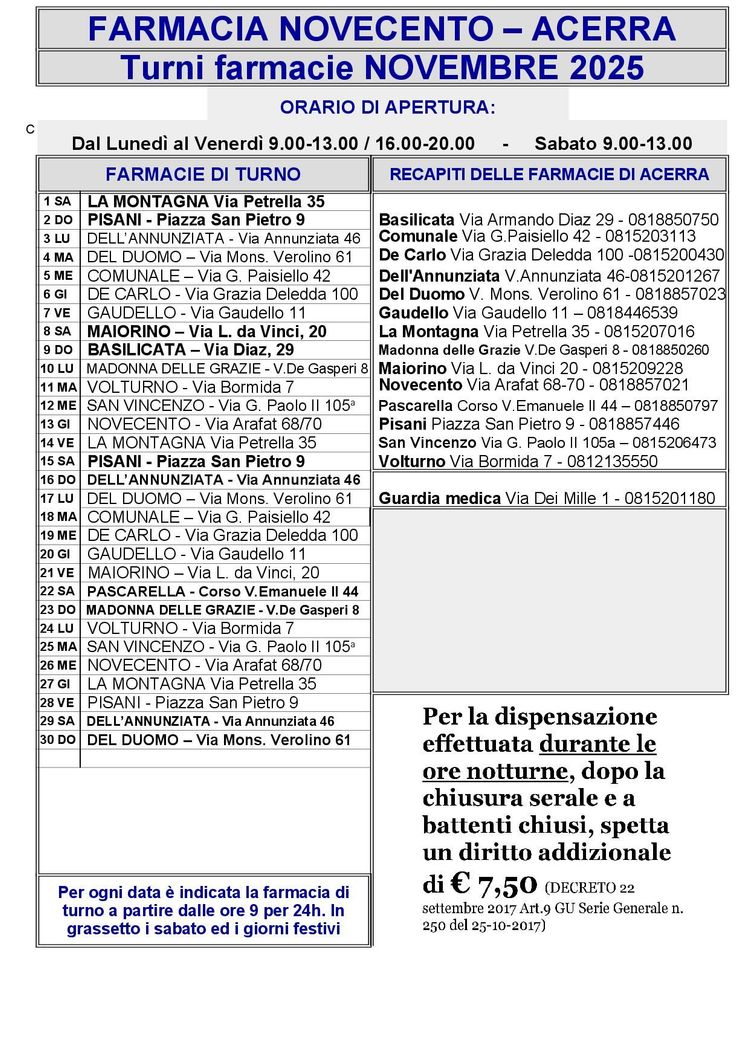La Farmacia Novecento è aperta tutti i giorni, dal lunedì al venerdì, dalle 9.00 alle 13:00 e dalle 16:00 alle 20:00, e il sabato mattina dalle 9:00 alle 13:00.